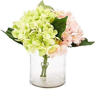 Farmlyn Creek 造花 アジサイフラワー ガラス花瓶付き (グリーン、ピンク、1パック)