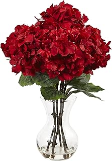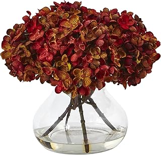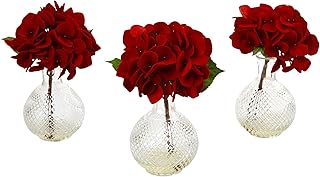 Nearly Natural 1441 高さ8.5インチ レッドアジサイシルクフラワーアレンジメント ガラス花瓶付き