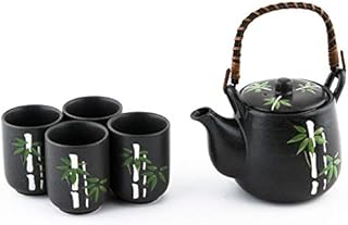 日本アジアラッキー竹デザインティーセットセラミックティーポットStrainer、Rattanハンドルと4ティーカップ