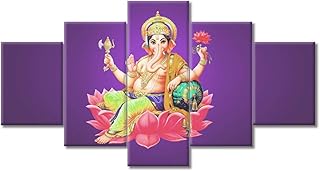 5パネル バスルーム装飾 ウォールアート ヒンドゥー教 ガネーシャ神 壁絵画 宗教的な写真 寝室 ガネーシュ チャルティ ホームデコ モダンアートワーク フレーム入りギャラリーラップ すぐに掛けられる(幅60インチ) x 高さ32インチ